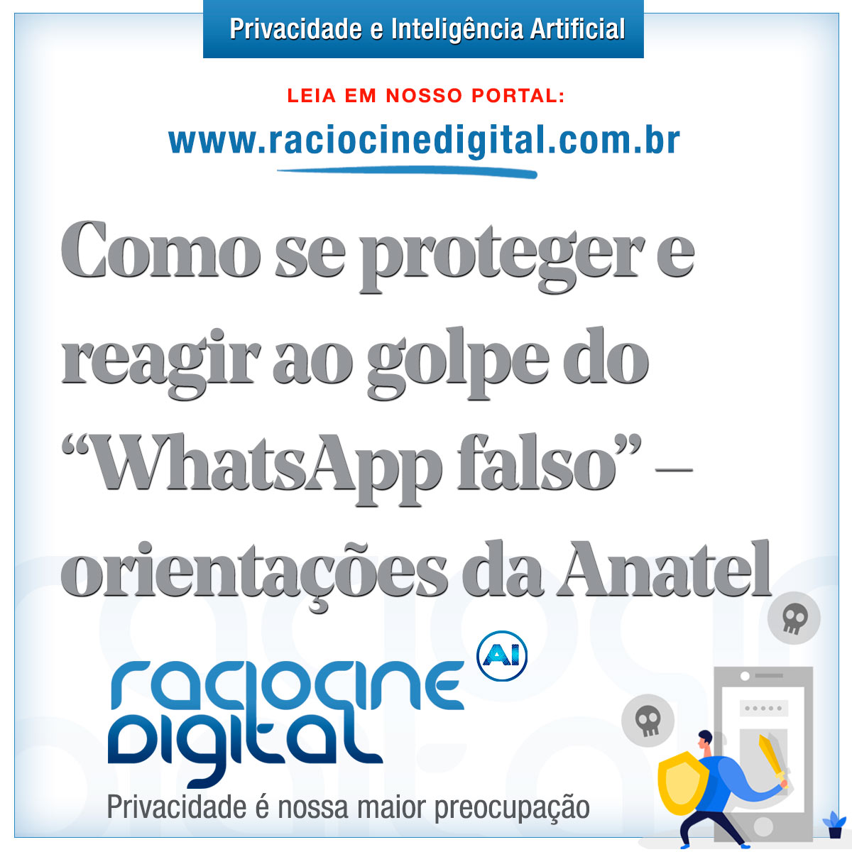 No portal da Anatel, há seção denominada “Dicas contra Fraudes”, com atualizações constantes sobre os principais golpes em circulação, incluindo o “WhatsApp falso”, e orientações detalhadas de identificação, prevenção e denúncia.